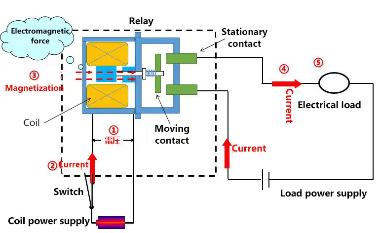 Khi cuộn dây (coil) được cấp điện, lõi sắt và phần ứng (armature) bị từ hóa, tạo ra một điện thế từ tại các cực và sinh ra lực hút điện từ giữa chúng. Khi lực hút này lớn hơn lực đàn hồi của lò xo, phần ứng bắt đầu chuyển động về phía lõi sắt, cho phép các tiếp điểm đóng lại và dòng điện chạy qua mạch.